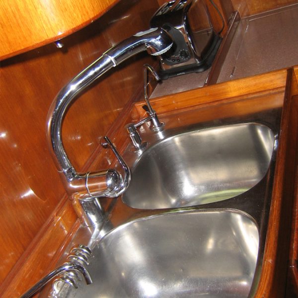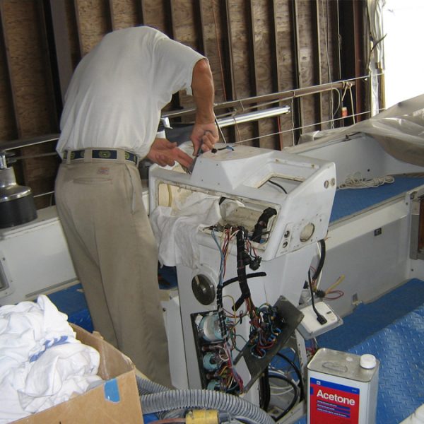 Our Mechanical Department removed the tankage & machinery to clean/de-scale the bilges. Repaired the steering system. Replaced the heads and sanitation systems. Re-worked the entire fresh-water plumbing systems. Re-configured and/or repaired the charging systems. Replaced the galley stove and entire propane system. Serviced the motors, thru-hulls, bilge pumps, running gear, watermaker, refrigeration systems, etc.